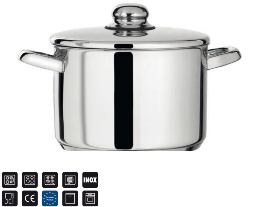 BATERÍA FABRICADA EN ACERO INOXIDABLE 18/10 TRIPLE FONDO DIFUSOR QUE ASEGURA UN EFICIENTE REPARTO DEL CALOR APTA PARA TODO TIPO DE COCINAS INCLUIDAS LAS DE INDUCCIÓN APTA PARA LAVAVAJILLAS TERMINACIÓN DEL CUERPO EN ACERO SATINADO SALVO EN SU PARTE SUPERIOR EMBALADO: CAJA CARTÓN 1 TINTA